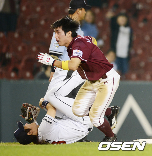 7일 오후 서울 잠실구장에서 열린 '2012 팔도 프로야구' 두산 베어스와 넥센 히어로즈 경기 연장 11회초 1사 주자 2루 넥센 강정호 타석에서 2루 주자 서건창이 3루 도루를 시도하였으나 두산 이원석의 다리와 충돌하며 이원석이 무릎쪽을 다치며 볼을 잡지 못했다. 이 후 서건창이 홈으로 달려 세이프되고 있다.