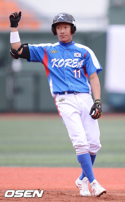 8일 오후 서울 목동구장에서 열린 제 25회 세계청소년야구선수권대회 대한민국과 일본과의 5-6위 전에서 2회초 1사 주자 1루 한국 송준석이 좌중간 선취 1타점 적시타를 날린 후 2루에서 기뻐하고 있다.