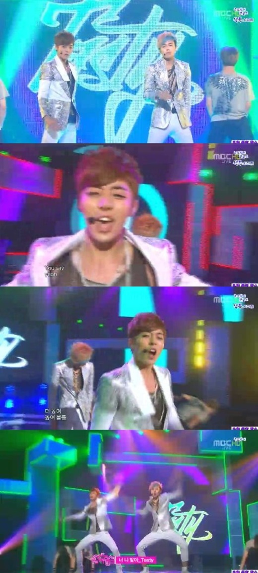 남성 듀오 테이스티가 MBC '쇼! 음악 중심' 무대에 올라 자극적인 가사와 함께 현란한 춤사위를 선보였다.
