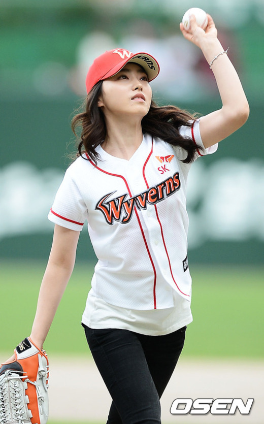 8일 오후 인천 문학구장에서서 열린 '2012 팔도 프로야구' SK 와이번스와 넥센 히어로즈의 경기에서 당구선수 차유람이 시구를 하고 있다.