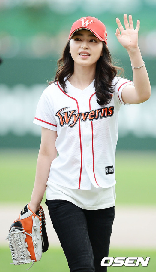 8일 오후 인천 문학구장에서서 열린 '2012 팔도 프로야구' SK 와이번스와 넥센 히어로즈의 경기에서 당구선수 차유람이 시구를 마친 후 인사를 하고 있다.