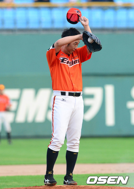 8일 오후 부산 사직구장에서 열린 '2012 팔도 프로야구' 롯데 자이언츠와 한화 이글스의 경기 1회초 윤근영이 땀을 닦고 있다.