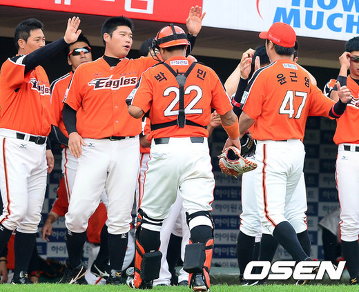 8일 오후 부산 사직구장에서 열린 '2012 팔도 프로야구' 롯데 자이언츠와 한화 이글스의 경기 2회말을 마친 윤근영이 덕아웃으로 향하며 동료들과 하이파이브를 하고 있다.