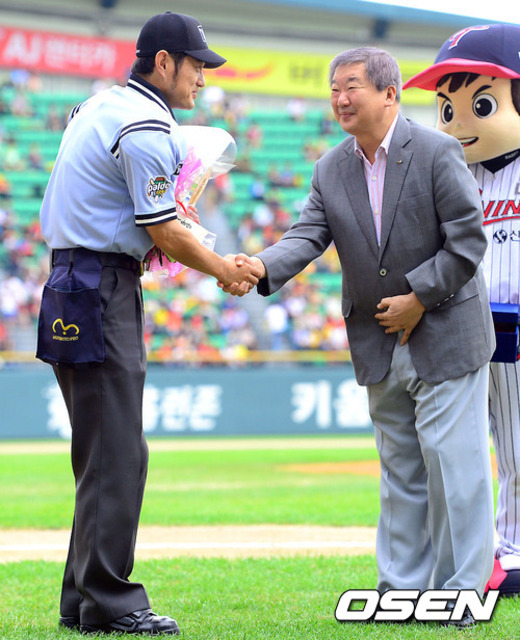 8일 오후 서울 잠실구장에서 열린 2012 팔도 프로야구 LG 트윈스와 KIA 타이거즈의 경기 전 나광남 심판이 2000경기 출장 KBO 기념 시상식을 하고 있다.