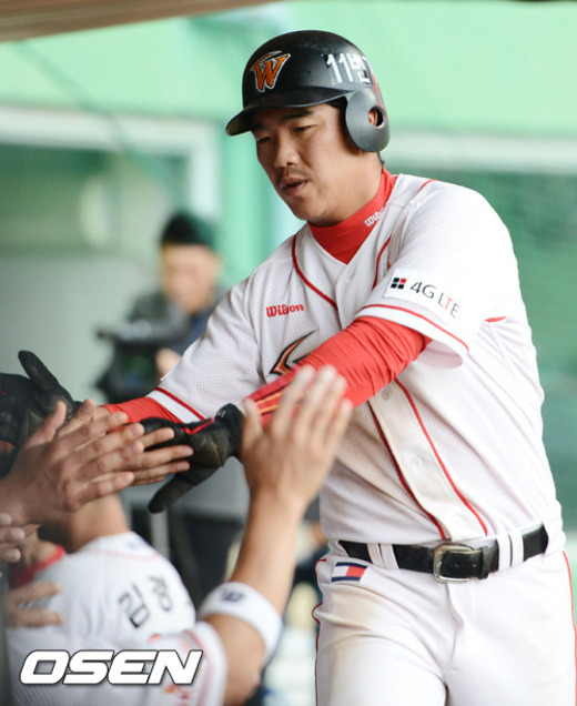 8일 오후 인천 문학구장에서서 열린 '2012 팔도 프로야구' SK 와이번스와 넥센 히어로즈의 경기 1회말 1사 주자 3루 SK 최정의 좌익수 뒤 1타점 적시타대 홈을 밟은 정근우가 덕아웃에서 동료들과 하이파이브를 하고 있다.