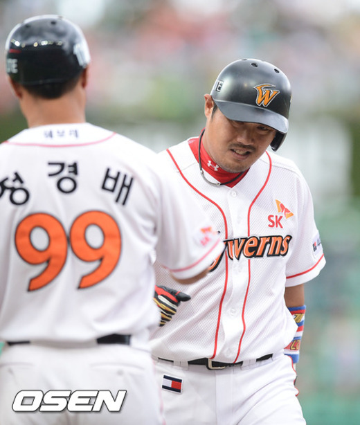 8일 오후 인천 문학구장에서서 열린 '2012 팔도 프로야구' SK 와이번스와 넥센 히어로즈의 경기 1회말 1사 주자 2루 SK 이호준이 중견수 앞 1타점 적시타를 날린 후 1루에서 정경배 코치와 하이파이브를 하고 있다.