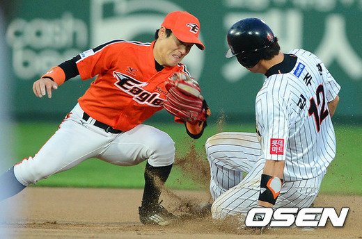8일 오후 부산 사직구장에서 열린 '2012 팔도 프로야구' 롯데 자이언츠와 한화 이글스의 경기 6회말 무사 1루 손아섭의 타석, 1루주자 김주찬이 도루에 성공하고 있다.