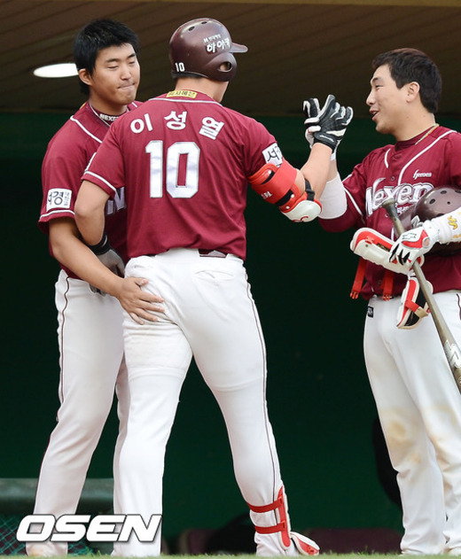 8일 오후 인천 문학구장에서서 열린 '2012 팔도 프로야구' SK 와이번스와 넥센 히어로즈의 경기 3회초 무사 주자 1루 넥센 이성열이 우월 투런 홈런을 날린 후 덕아웃에서 허도환과 하이파이브를 할때 넥센 선발 김영민이 이성열의 엉덩이를 치고 있다.