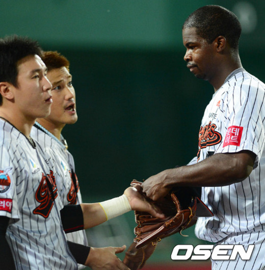8일 오후 부산 사직구장에서 열린 '2012 팔도 프로야구' 롯데 자이언츠와 한화 이글스의 경기 7회초 2사 1루 박노민을 삼진으로 처리한 유먼이 덕아웃으로 향하며 동료들과 하이파이브를 하고 있다.