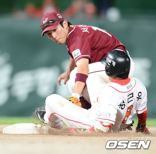 8일 오후 인천 문학구장에서서 열린 '2012 팔도 프로야구' SK 와이번스와 넥센 히어로즈의 경기 6회말 1사 주자 없는 상황에서 SK 정근우가 좌익수 왼쪽 1루타를 날린 후 그대로 2루까지 달렸으나 2루에서 서건창에게 태그아웃 당하고 있다.