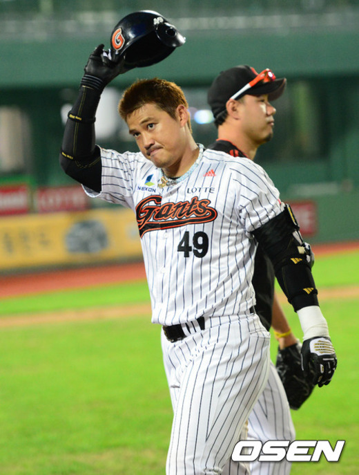 8일 오후 부산 사직구장에서 열린 '2012 팔도 프로야구' 롯데 자이언츠와 한화 이글스의 경기 8회말 2사 솔로포를 친 홍성흔이 팬들에게 인사를 하고 있다.
