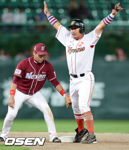 8일 오후 인천 문학구장에서서 열린 '2012 팔도 프로야구' SK 와이번스와 넥센 히어로즈의 경기 7회말 무사 주자 1루 SK 박정권 타석에서 1루 주자 이호준이 2루 도루에 성공한 후 두 팔을 들어올리고 있다.