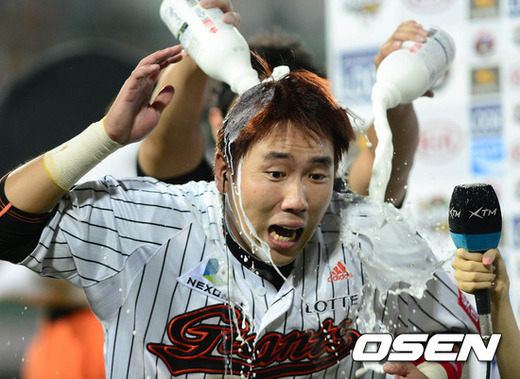 8일 오후 부산 사직구장에서 열린 '2012 팔도 프로야구' 롯데 자이언츠와 한화 이글스의 경기 종료 후 전준우가 인터뷰 도중 황재균의 우유 세례에 놀라고 있다.