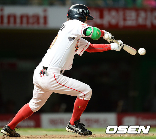 8일 오후 인천 문학구장에서서 열린 '2012 팔도 프로야구' SK 와이번스와 넥센 히어로즈의 경기 7회말 무사 주자 1,3루 SK 조동화가 1루수 오른쪽 1타점 역전 번트 적시안타를 날리고 있다.