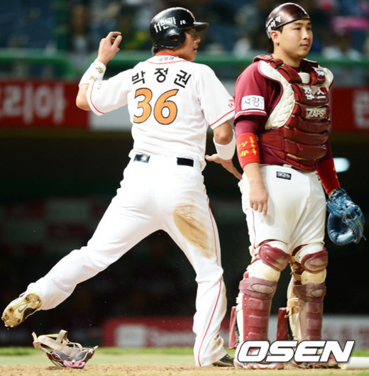 8일 오후 인천 문학구장에서서 열린 '2012 팔도 프로야구' SK 와이번스와 넥센 히어로즈의 경기 7회말 무사 주자 1,3루 SK 조동화의 1루수 오른쪽 1타점 역전 번트 적시안타때 홈을 밟은 박정권이 한바퀴 돌고 있다.