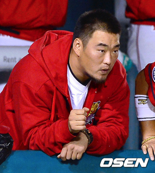 8일 오후 서울 잠실구장에서 열린 2012 팔도 프로야구 LG 트윈스와 KIA 타이거즈의 경기 연장 12회초 1사 1,2루 KIA차일목의 타석때 김진우가 긴장된 표정으로 경기를 지켜보고 있다.