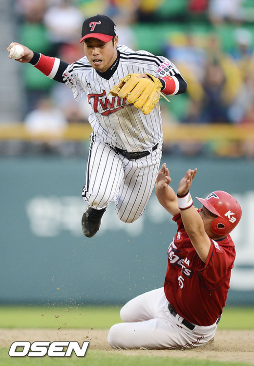 9일 오후 서울 잠실구장에서 열린 '2012 팔도 프로야구' LG 트윈스와 KIA 타이거즈의 경기에서 5회초 무사 주자 1루 KIA 안치홍의 유격수 앞 땅볼때 1루 주자 박기남이 2루에서 포스아웃 되며 팔을 뻗고 LG 2루수 김태완이 1루로 송구를 결국 하지 못했다.