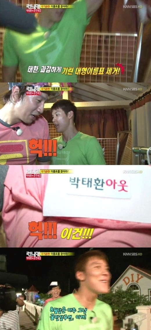 이광수가 자신의 팀원인 개리의 이름표를 떼자 박태환은 전속력을 다해 이광수를 잡았다. 박태환을 본 이광수는 자신이 개리의 이름표를 떼지 않았다고 우겼다. 박태환은 이광수의 말을 믿지 않았고 큰 이름표를 뗐다. 하지만 박태환이 아웃이 됐다.