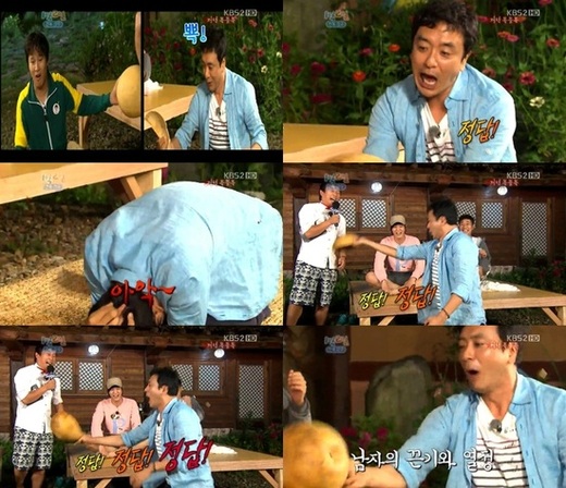 김승우는 9일 오후 방송된 KBS 2TV 예능프로그램 '해피선데이-1박 2일(이하 '1박 2일')'에서 박 깨기 하나로 몸개그를 폭발시키며 시청자들에게 큰 웃음을 선사했다.