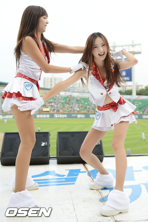 9일 오후 서울 잠실구장에서 열린 '2012 팔도 프로야구' LG 트윈스와 KIA 타이거즈의 경기에서 LG 치어리더 강윤이와 김민지가 화려한 공연을 펼치고 있다.