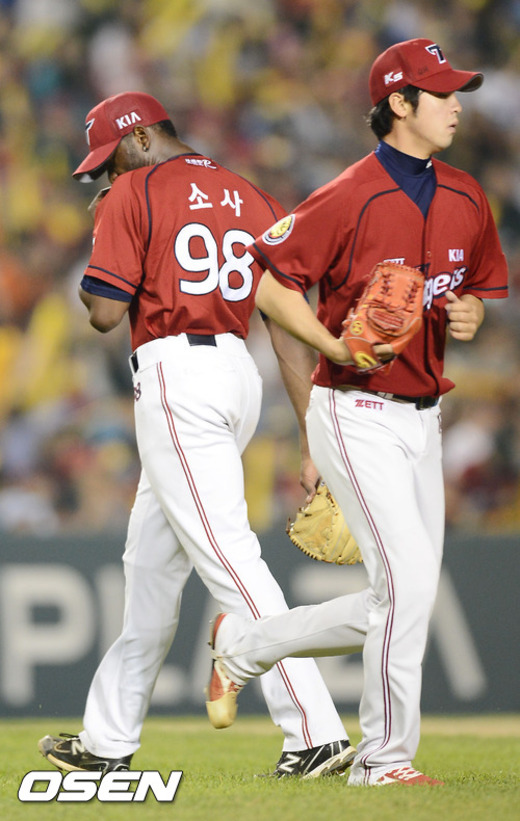 9일 오후 서울 잠실구장에서 열린 '2012 팔도 프로야구' LG 트윈스와 KIA 타이거즈의 경기에서 7회말 1사 주자 1,3루 LG 이진영 타석에서 KIA 선발 소사가 마운드를 내려오며 진해수가 마운드에 오르고 있다.