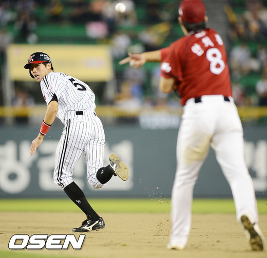 9일 오후 서울 잠실구장에서 열린 '2012 팔도 프로야구' LG 트윈스와 KIA 타이거즈의 경기에서 7회말 1사 주자 1,3루 LG 이진영이 2루수 앞 동점 1타점 적시타때 1루 주자 김용의가 KIA 2루수 안치홍의 태그를 피한 후 2루로 향하고 있고 태그에 실패했던 안치홍은 1루로 송구하려 했으나 이진영이 1루에서 이미 세이프 되자 다시 2루로 볼을 송구하고 있다.