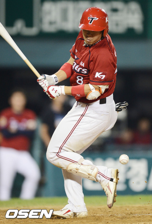 9일 오후 서울 잠실구장에서 열린 '2012 팔도 프로야구' LG 트윈스와 KIA 타이거즈의 경기에서 9회초 2사 주자 1,2루 KIA 안치홍이 몸에 볼을 맞으며 만루가 되고 있다.