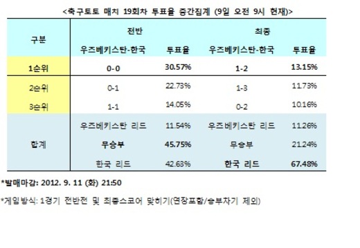국민체육진흥공단(www.kspo.or.kr)이 발행하는 체육진흥투표권 수탁사업자 스포츠토토의 공식 온라인 발매 사이트 베트맨(www.betman.co.kr)이 9월 11일(화) 오후 10시 우즈베키스탄 파크타코르 센트럴 스타디움에서 열리는 2014년 브라질 월드컵 아시아 최종예선 3차전 우즈베키스탄-한국전을 대상으로 한 축구토토 매치 19회차 투표율 중간집계 결과, 전체 참가자의 67.48%는 한국의 승리를 전망했다.
