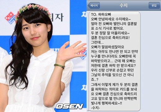 하하와 수지는 SBS ‘일요일이 좋다-런닝맨’에서 신랑신부 역할을 맡으며 인연을 만들어 방송 후에도 오빠 동생으로 좋은 관계를 유지해 왔다. 또한 토크쇼에 출연한 하하가 수지에게 “아무 남자나 만나지 말고 남자 친구가 생기면 꼭 나에게 허락을 받고 만나야 한다”고 영상 메시지도 남기며 두터운 친분을 과시하기도 했다.