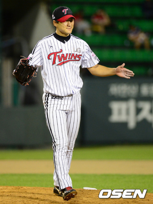10일 오후 서울 잠실구장에서 열린 '2012 팔도 프로야구' LG 트윈스와 KIA 타이거즈의 경기, 7회초 2사에서 LG 선발 신재웅이 KIA 이준호를 내야땅볼로 처리하고 박수를 치며 마운드를 내려오고 있다. 신재웅은 7이닝 1실점하고 8회 유원상과 교체됐다..