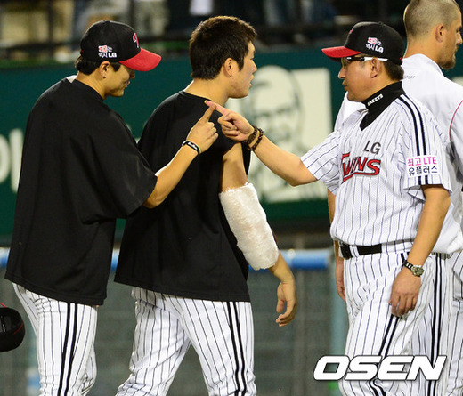 경기후 LG 김기태 감독이 선발투수 신재웅과 손가락 세리머니를 하고 있다. /jpnews@osen.co.kr