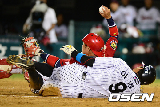8회말 2사 2,3루에서 LG 2루주자 이병규가 최영진의 적시타에 홈까지 파고 들었지만 KIA 이성우에 태그아웃당하고 있다. /jpnews@osen.co.kr