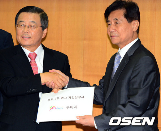 11일 오전 서울 대한축구협회 축구회관 대회의실에서 진행된 구미 연고 프로축구 2부리그 팀 창단 신청 기자회견에서 남유진 구미시장이 김정남 대한프로축구연맹 부총재에게 프로 2부리그 가입신청서를 전달하고 있다.