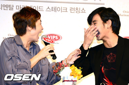 11일 오전 여의도 CGV에서 진행된 빕스 오리엔탈 마리네이드 스테이크 런칭 기념 '스테이크&토크쇼'에서 박경림과 김수현이 토크 도중 함박웃음을 짓고 있다.