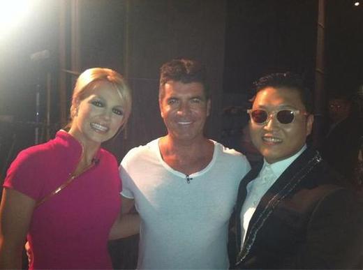 이 사진에는 브리트니 스피어스와 미국의 인기 오디션 프로그램 '아메리칸 아이돌'의 심사위원 사이먼 코웰, 싸이가 나란히 서 있는 모습이 담겼다. 세 사람 모두 환한 미소를 지으며 화기애애한 분위기를 연출했다.