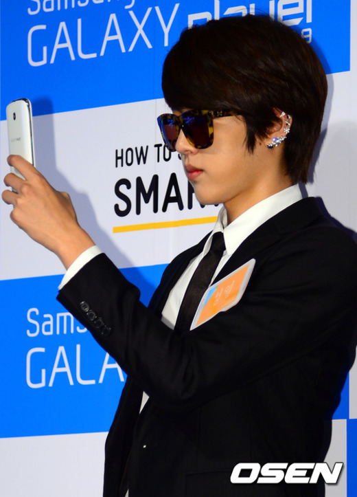 11일 오후 서울 서초구 삼성전자 딜라이트에서 진행된 삼성 갤럭시 플레이어 5.8 출시 기념 인피니트 일일판매 사원 이벤트에서 인피니트 성열이 핸드폰을 만지며 장난을 치고 있다.