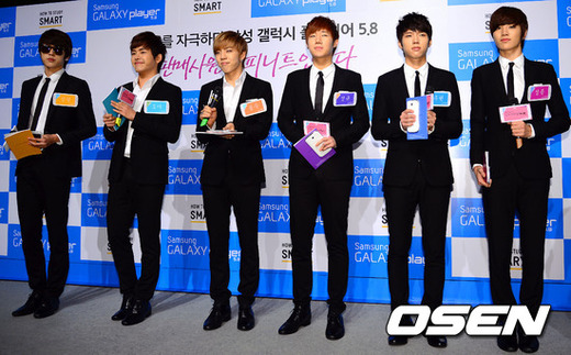 11일 오후 서울 서초구 삼성전자 딜라이트에서 진행된 삼성 갤럭시 플레이어 5.8 출시 기념 인피니트 일일판매 사원 이벤트에서 인피니트(김성규, 장동우, 남우현, 호야, 이성열, 이성종)가 팬들에게 인사를 하고 있다.