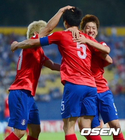 11일(한국시간) 우즈베키스탄 타슈켄트의 파흐타코르 센트럴 스타디움에서 2014 브라질월드컵 아시아 최종예선 3차전 한국과 우즈베키스탄의 경기, 전반 곽태휘가 동점골을 넣고 이청용과 기쁨을 나누고 있다.