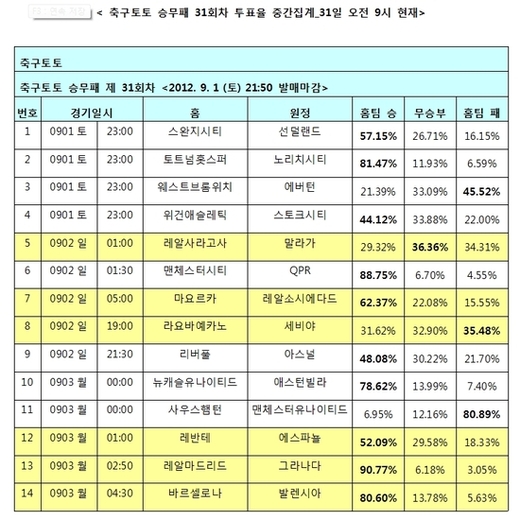[축구토토] 축구토토 승무패 31회차 투표율 중간집계 결과