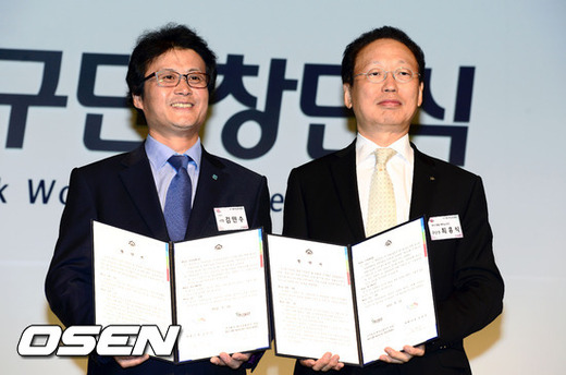 12일 오전 용산구 한남동 그랜드 하얏트 호텔 리젠시룸에서 열린 '하나 외환 여자농구단' 창단식에서 김만수 부천시장과 최흥식 구단주가 협약서를 들고 포토타임을 갖고 있다.