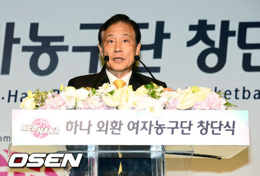 12일 오전 용산구 한남동 그랜드 하얏트 호텔 리젠시룸에서 열린 '하나 외환 여자농구단' 창단식에서 김정태 하나금융그룹 회장이 인사말을 전하고 있다.