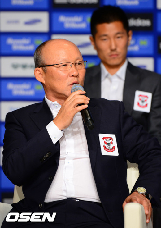12일 오전 서울 아산청책연구원에서 진행된 '2012 K리그 스플릿 시스템 그룹B'(인천, 대구, 성남, 전남, 대전, 광주, 상주, 강원) 기자회견에서 박항서 감독이 취재진의 강등권팀을 지명해달라는 질문에 답변하고 있다.