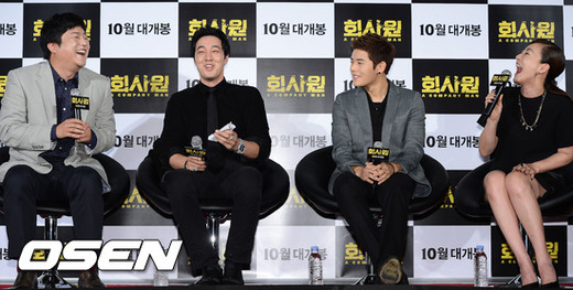 12일 오전 동대문 메가박스에서 열린 영화 '회사원' 제작보고회에서 곽도원 소지섭 김동준 이미연이 환하게 웃고 있다.