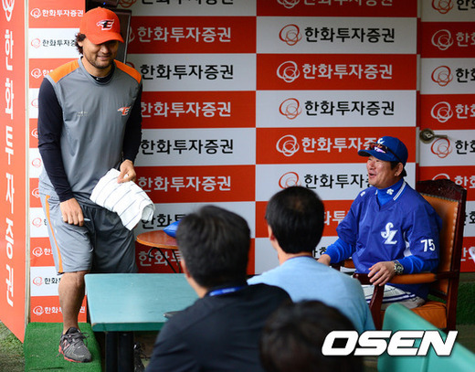 12일 오후 대전구장에서 열린 '2012 팔도 프로야구' 한화 이글스와 삼성 라이온즈의 경기, 경기에 앞서 한화 박찬호가 삼성 류중일 감독에게 사인을 받고 인사를 나누고 있다.