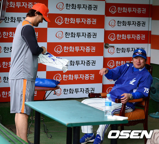 12일 오후 대전구장에서 열린 '2012 팔도 프로야구' 한화 이글스와 삼성 라이온즈의 경기, 경기에 앞서 한화 박찬호가 삼성 더그아웃으로 찾아 류중일 감독에게 사인을 받고 인사를 나누고 있다.