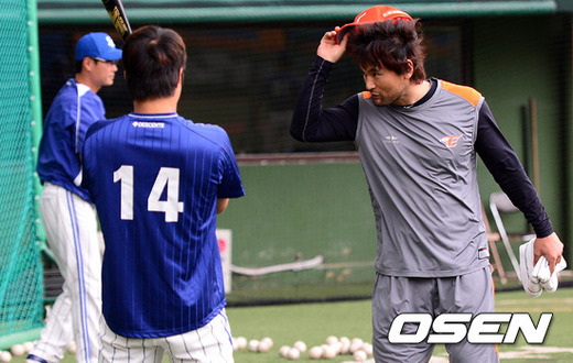 12일 오후 대전구장에서 열린 '2012 팔도 프로야구' 한화 이글스와 삼성 라이온즈의 경기, 경기에 앞서 한화 박찬호가 훈련중인 삼성 선수들과 인사를 나누고 있다.