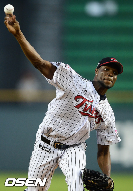 12일 오후 서울 잠실구장에서 열린 '2012 팔도 프로야구' LG 트윈스와 SK 와이번스의 경기에서 LG 리즈가 힘차게 공을 뿌리고 있다.