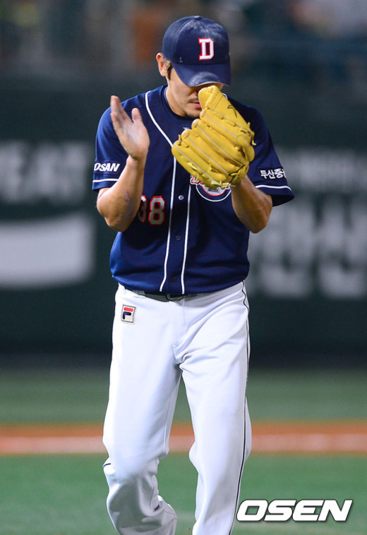 12일 오후 서울 목동구장에서 열린 2012 팔도 프로야구 넥센 히어로즈와 두산 베어스의 경기 1회말 두산 선발투수 노경은이 만루 위기를 넘긴후 박수를 치고 있다.
