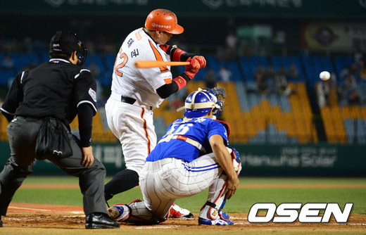 12일 오후 대전구장에서 열린 '2012 팔도 프로야구' 한화 이글스와 삼성 라이온즈의 경기, 1회말 1사 1,2루에서 한화 김태균이 선제 1타점 적시타를 날리고 있다.