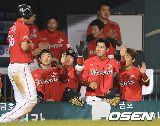 12일 오후 서울 잠실구장에서 열린 '2012 팔도 프로야구' LG 트윈스와 SK 와이번스의 경기에서 4회초 1사 주자 2루 SK 임훈의 땅볼때 LG 1루수 김용의와 2루수 서동욱의 실책으로 볼이 빠지며 2루 주자 박정권이 홈에서 세이프된 후 덕아웃에서 동료들과 하이파이브를 하고 있다.